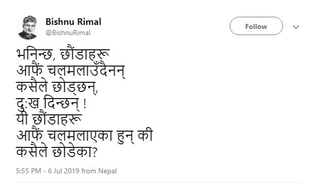 कसैले छोडेका?— Bishnu Rimal (@BishnuRimal) July 7, 2019