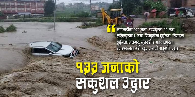 काठमाडौँमा ४२, उदयपुरमा १०, ललितपुरमा तीन, सिन्धुलीमा चार, सिराहमा दुई, भक्तपुर, सुनसरी र मकवानपुरमा एक÷एक जना गरी ६४ जनाको सकुशल उद्धार गरिएको छ । बाढी पहिरोबाट ठूलो मात्रामा धनमालसमेत क्षति भएको छ ।