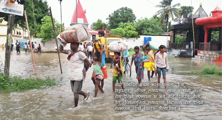 जनस्वास्थ्य विशेषज्ञहरूले मुलुकको बाढी प्रभावित तराई क्षेत्रमा पानी र किटजन्य महामारी फैलिन सक्ने चेतावनी दिएका छन् । यस पटकको बाढीमा धेरै मात्रामा तराईका शहरी र ग्रामिण जनसंख्या प्रभावित रहेकाले प्रकोपको जोखिमसमेत उच्च रहेको बताइएको छ ।