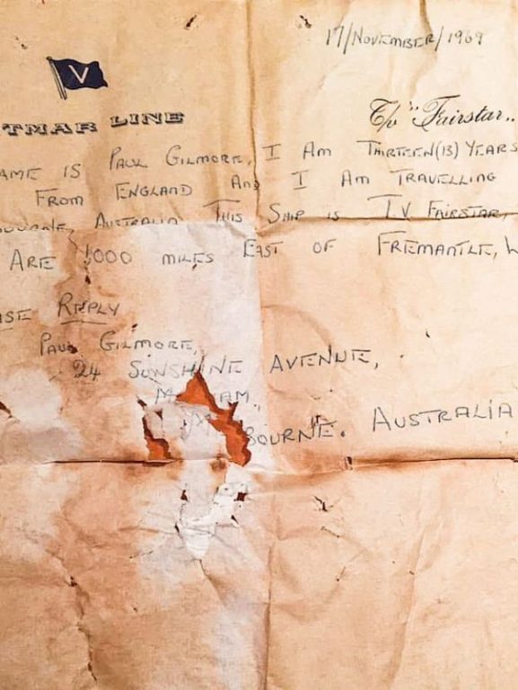 सुरक्षित रूपमा भेटिएको सो पत्र लेख्दा पोल गिल्मोर १३ वर्षका थिए। सपरिवार यूकेबाट मेल्बर्न जाँदा पानीजहाजबाट उनले त्यो सन्देश समुद्रमा छोडेका थिए।