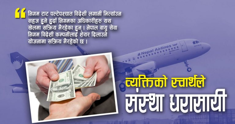 साउन ३, काठमाण्डौ । पछिल्लो समय नेपाल वायुसेवा निगमलाई ऋणमा डुबाई विदेशी लगानी भित्र्याउने र त्यस वापत कमिसन खाने गृहकार्य चलिरहेको छ । वाइडवडी जहाजलाई पनि थन्क्याएर घाटाको व्यापार गरी निगमलाई टाट पल्टाउने खेलमा निगमकै उच्च पदस्थ अधिकारी लागि रहेका छन् ।