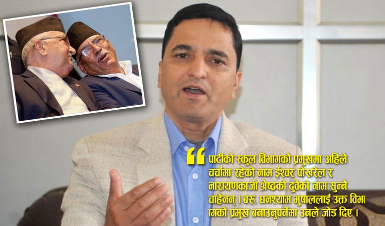 उनले पार्टीको स्कुल विभागको प्रमुखमा अहिले चर्चामा रहेको नाम ईश्वर पोखरेल र नारायणकाजी श्रेष्ठको दुवैको नाम सुन्नै चाहेनन् । बरु, घनश्याम भुषाललाई उक्त विभागको प्रमुख बनाउनुपर्नेमा उनले जोड दिए । उनले अध्यक्षद्धय ओली र प्रचण्डलाई आफुहरुले धेरै मान्नुको मुख्य कारणमा उनीहरुको नराम्रो कुराभन्दापनि राम्रा कुरा बढि भएकोले मानेको सुनाए ।