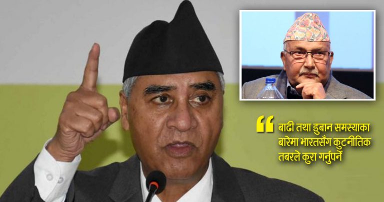 काठमाडौं, ८ साउन । प्रमुख प्रतिपक्षी दल नेपाली कांग्रेसका सभापति शेरबहादुर देउवाले बाढी तथा डुबान समस्याका बारेमा भारतसँग कुटनीतिक तबरले कुरा गर्नुपर्ने बताएका छन्।