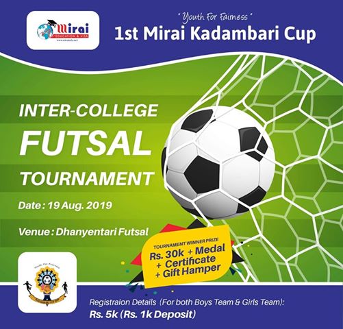निष्पक्षतामा लागि युवा भन्ने मुल नारामा साथ कादम्बरि मेमोरियल कलेजको आयोजनामा प्रथम मिराई कादम्करी कप २०१९ अन्तरविद्यालय फुटसल प्रतियोगिता हुने भएको छ । अन्तराष्टिय युवा दिवसको अवसरमा विद्यालयबीच भाइचारा र विद्यार्थीको प्रतिभा प्रस्फुटनका लागि प्रतियोगिता आयोजना गर्न लागेको फुटसल लिगकम नकआउटका आधारमा सञ्चालन हुने प्रथम मिराई कादम्बरी कप २०१९ का संयोजक खिमानन्द देबकोटाले जानकारी दिए ।
