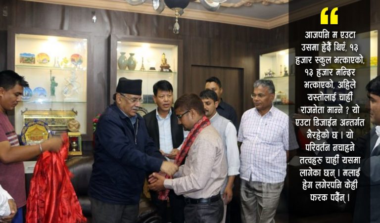 दाहालले भने,‘यो व्यवस्था नै उल्टियो भने नेपाल नै बर्बाद हुने खतरा छ । जनता र राष्ट्रलाई माया गर्ने र परिवर्तनलाई रुचाउने सबै इमान्दार नेता तथा कार्यकर्ता एक ठाउँमा एकतावद्ध भएर यो व्यवस्थाको रक्षा गर्नुपर्छ ।’ सोमबार आफ्नै निवास खुमल्टारमा विप्लव समुह परित्याग गरी नेकपामा प्रवेश गर्ने सो समुहका ब्यूरो सदस्य तथा बारा जिल्लाका पूर्व सचिव रमण घिमिरे लगायतका नेता तथा कार्यकर्ताहरुलाई पार्टीमा स्वागत गर्दै यस्तो धारणा राखेका हुन् ।