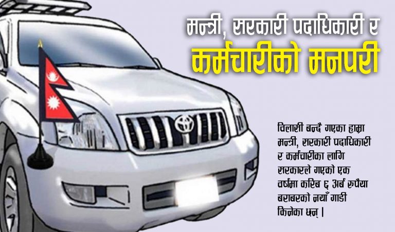 साउन १४, काठमाण्डौ । विलासी बन्दै गएका हाम्रा मन्त्री, सरकारी पदाधिकारी र कर्मचारीहरुका लागि सरकारले गएको एक वर्षमा करीब ६ अर्ब रुपैया बराबरको नयाँ गाडी किनेका छन् । त्यो पनि संघ अन्तर्गतका मन्त्रालय, निकाय र कार्यालयहरुले मात्रै ।