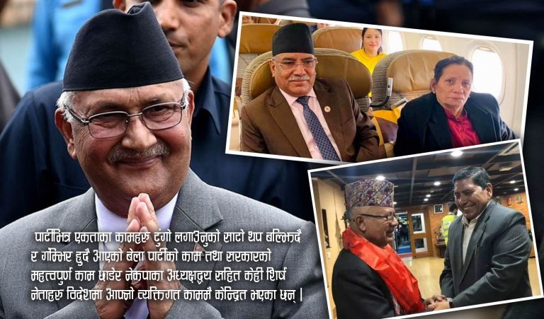 नेपालीमा एउटा उखान छ काम कुरो एकातिर कुम्लो बोकी ठिमितिर । अहिले सत्तारुढ दल नेकपाका नेताहरुलाई यही उखान ठ्याक्कै मिलेको छ । पार्टीभित्र एकताका कामहरु टुंगो लगाउनुको साटो थप बल्झिदै र गंम्भिर हुदै आएको बेला पार्टीको काम तथा सरकारको महत्वपुर्ण काम छाडेर नेकपाका अध्यक्षद्धय सहित केही शिर्ष नेताहरु विदेशमा आफ्नो व्यत्तिगत काममै केन्द्रित भएका हुन ।