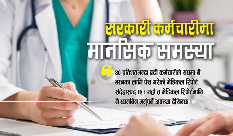 रिपोर्टर्स नेपाल खोज । सरकारी सेवामा प्रवेश गर्दा उनीहरु मानसिक रुपमा सशक्त थिए । मालदार अड्डामा बस्दा झन् सशक्त भए । प्रदेश र स्थानीय तहमा कर्मचारी समायोजन नगर्दा पनि उनीहरु सामान्य अवस्थामा थिए । तर, सरकारले समायोजन गरेर प्रदेश र स्थानीय तहमा खटाएपछि ठूलो संख्यामा कर्मचारीहरुले मानसिक समस्यामा परेको मेडिकल रिपोर्ट बनाएका छन् । के उनीहरुले साँच्चै मानसिक सन्तुलन गुमाएकै हुन् ?
