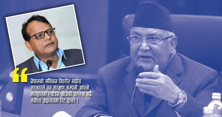 काठमाडौं । सङ्घीय सरकारले नेपालको संविधान विपरीत वन संरक्षण कम्पनी आफ्नो मातहातमा ल्याउन खोजेको उल्लेख गर्दै सर्वोच्च अदालतमा रिट निवेदन दायर गरिएको छ । प्रदेश नं २ सरकारको उद्योग, पर्यटन, वन तथा वातावरण मन्त्रालयका तर्फबाट सहायक भूसंरक्षण अधिकृत वेचनकुमार महतोले आज प्रधानमन्त्री तथा मन्त्रिपरिषद्को कार्यालय सिंहदरबार काठमाडौँलाई विपक्षी बनाइ रिट निवेदन दायर गरेका हुन् ।