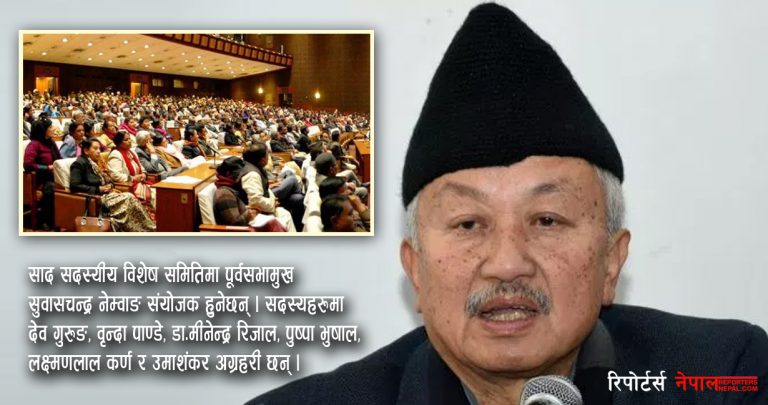 साद सदस्यीय विशेष समितिमा पूर्वसभामुख सुवासचन्द्र नेम्वाङ संयोजक हुनेछन् । सदस्यहरुमा देव गुरुङ, वृन्दा पाण्डे, डा.मीनेन्द्र रिजाल, पु्ष्पा भुषाल, लक्ष्मणलाल कर्ण र उमाशंकर अग्रहरी छन् । समितिले संसदमा उत्पन्न हुने गतिरोधको अवस्था आउन नदिन सुझाव दिनेछ । Photo: File