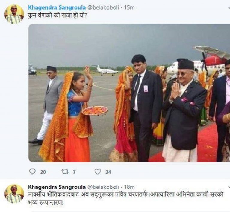 लगातार ट्वीट गर्ने क्रममा ओलीले पहिलो ट्वीटमा ओलीको रुपान्तरणलाई व्यङ्ग्य गरेका छन् । उनले लेखेका छन्,”माक्र्सीय भौतिकवादबाट अब सद्गुरुका पवित्र चरणतर्फ । अपत्यारिला अभिनेता काजी सरको भव्य रुपान्तरण ।”