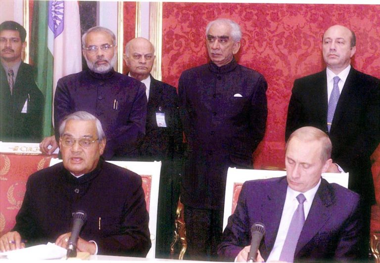 सन् २००१ को समिटमा सार्वजनिक गरिएको तस्बिरमा मोदी अटल विहारी वाजपेयीको ठिक पछाडि उभिएका छन् । पुटिन बाजपेयीको छेवैमा उभिएका देखिन्छन् ।