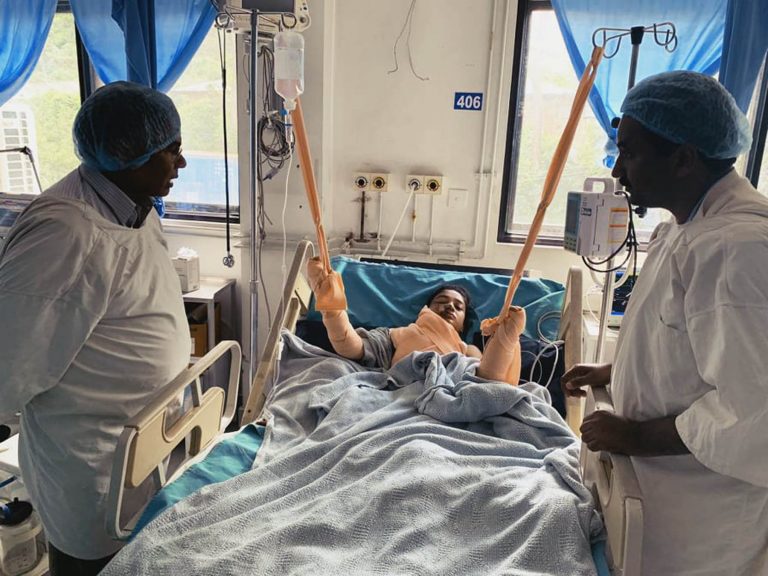 एसिड आक्रमणबाट पीडित भई उपचाररत मुस्कान खातुनलाई भेटने क्रममा उद्योग, वाणिज्य तथा आपूर्तिमन्त्री मातृकाप्रसाद यादव र नेकपा प्रदेश नम्बर २ का अध्यक्ष एवम प्रतिनिधिसभा सदस्य प्रभु साह । तस्वीर : सौजन्य, मन्त्रीको सचिवालय