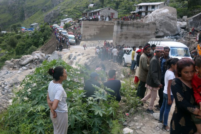 तिलागुफा नगरपालिका–७ टाकुल्ला कालीकोटस्थित कर्णाली राजमार्गको सडक बाढीले अवरुद्ध भएपछि सडक सुचारुको आशामा कुरेर बसेका यात्रु ।