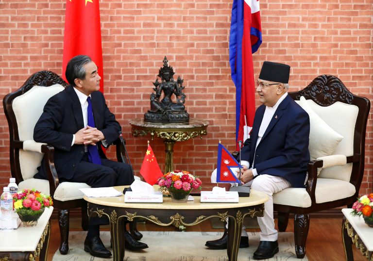 काठमाडौं, २३ भदौ । तीन दिने नेपाल भ्रमणमा रहेका चिनियाँ विदेशमन्त्री वाङ यी र प्रधानमन्त्री केपी शर्मा ओलीबीच भेटवार्ता सुरु भएको छ । प्रधानमन्त्री केपी शर्मा ओलीसँग भेट गर्न चिनियाँ विदेशमन्त्री वाङ प्रधानमन्त्रीको सरकारी निवास बालुवाटार पुगेका हुन् ।