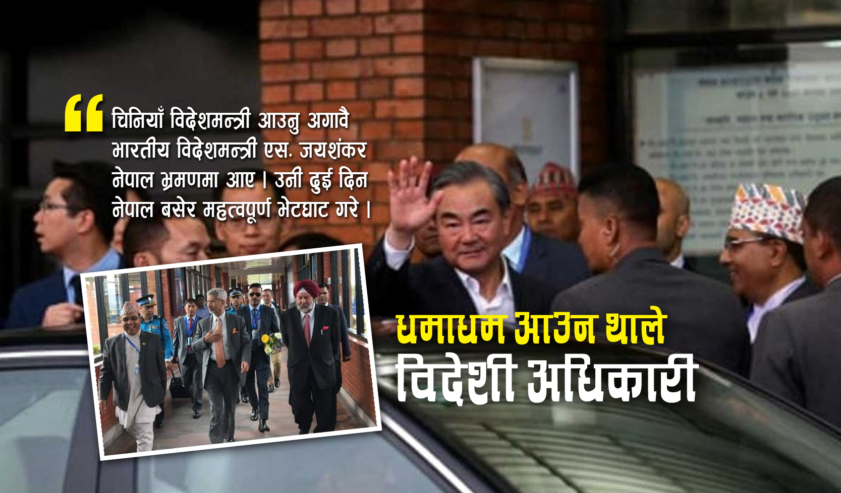 चिनियाँ विदेशमन्त्री आउनु अगावै भारतीय विदेशमन्त्री एस. जयशंकर नेपाल भ्रमणमा आए । उनी दुई दिन नेपाल बसेर महत्वपूर्ण भेटघाट गरे । विदेशमन्त्री भएपछि उनको नेपाल भ्रमण पहिलो हो । यसअघि विदेश सचिव रहेका जयशंकरको भ्रमणका क्रममा भारतीय प्रधानमन्त्री नरेन्द्र मोदीलाई नेपाल भ्रमणको निम्तो दिइएपनि टुंगो लागेको छैन ।