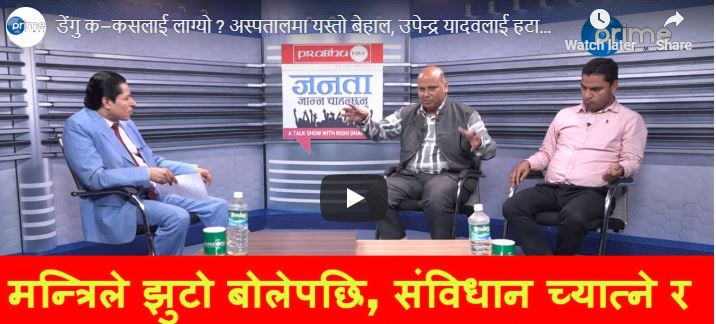 काठमाडौं, २७ भदौ । देश यतिवेला डेंगुको संक्रमणबाट आक्रान्त बनेको छ । यो विषय अहिले संघीय संसदको प्रतिनिधिसभाको बैठकमा समेत उठिसकेको छ । सांसदहरुले बहालवाला स्वास्थ्य तथा जनसंख्यामन्त्री उपेन्द्र यादवलाई तत्काल हटाउन माग गरिसकेका छन् ।बिहीबार राति प्राईम टाईम्स टेलिभिजनबाट प्रशारण भएको कार्यक्रम ‘जनता जान्न चाहन्छन्’ मा स्वास्थ्य राज्यमन्त्री डा. सुरेन्द्र यादवले डेंगुको नियन्त्रणको लागि सरकारले आवश्यक कदम चालेको सुनाए ।