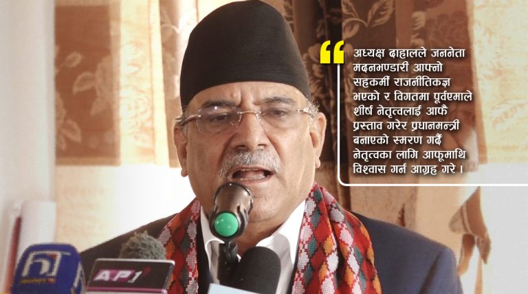 काठमाडौं २९ भदौ । नेपाल कम्युनिष्ट पार्टी (नेकपा)का अध्यक्ष पुष्पकमल दाहालले पार्टीभित्र आफ्नो कार्यकारी एकल नेतृत्व स्वीकार गर्न माग गरेका छन् । अर्का अध्यक्ष तथा प्रधानमन्त्री केपी शर्मा ओलीका गृह जिल्लामा उनले नेतृत्वका लागि विश्वास गर्न कार्यकर्तासमक्ष आग्रह समेत गरे ।