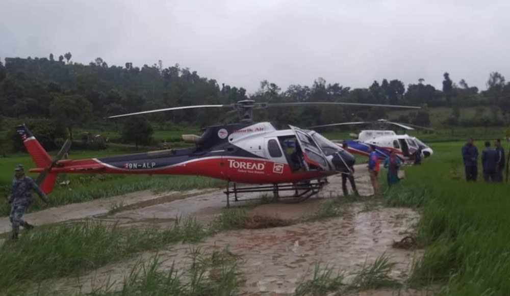 जोरपाटी र हर्सेमा अवतरण गरिएका हेलिकोप्टरमध्ये दुईका चालक दल नेपाली र दुईका विदेशी रहेका वडाध्यक्ष खतिवडाले बताए । हेलिकोप्टर धानखेतमा अवतरण गरिएको छ ।