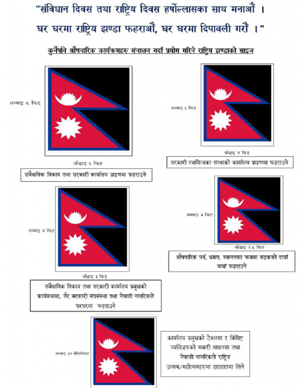 • संबैधानिक निकाय तथा सरकारी कार्यालय प्रमुखको टेबुलमा र विशिष्ट व्यक्तिहरुले प्रयोग गर्ने सवारी साधनमा राखिने राष्ट्रिय झण्डाको आकार ३०X२० सेन्टिमिटर