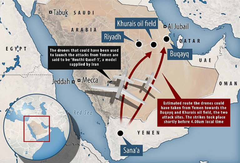 घटनाको पाँच दिनपछि औपचारिक धारणा सार्वजनिक गर्दै साउदीले १८ ड्रोन र सात क्षेप्यास्त्र आक्रमण भएको खुलाएको छ । साउदी रक्षा मन्त्रालयले इरानको भूमिका रहेको प्रमाणित भएको जनाएको छ । उसले भनेको छ, इरानले प्रायोजन गरेको आक्रमण भएकोमा कुनै प्रश्न छैन । इरानका रक्षा मन्त्रालयका प्रवक्ता टुर्की अल मल्कीले इरानको मानवरहित यानको भागहरु प्रमाणका रुपमा प्रस्तुत गरेका थिए ।