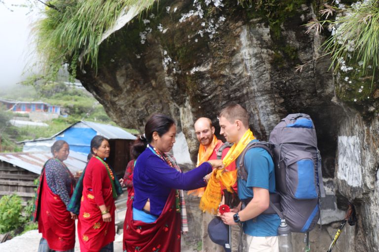 मनाङ नासों गाउँपालिका ४ स्थित घरबासमा आएका पाहुनालाई खादा र मालाले स्वागत गर्दै ओडार गाउँका महिला ।