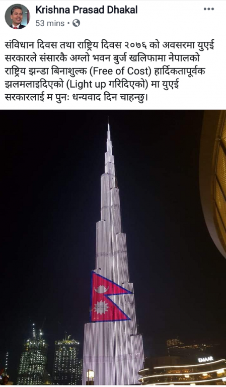 यसअघि युनाइटेड अरब इमिरेट्सको समय अनुसार शुक्रबार ९ बजेर १० मिनेटमा बुर्ज खालिफाको भित्तामा नेपाली झण्डा झलमलाएको थियो ।