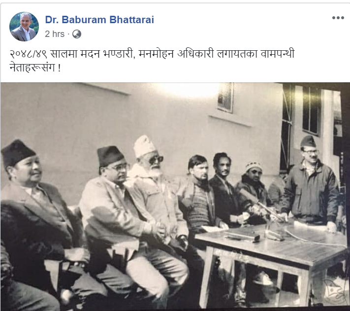 काठमाडौं, ५ असोज । सत्तारुढ दल समाजवादी पार्टीका संघीय परिषद अध्यक्ष डा बाबुराम भट्टराई सामाजिक सञ्जालमा सक्रिय नेताहरुको अग्रपँक्तिमा पर्छन् । उनी कहिले समसामयिक विषयमा आफ्नो धारणा सार्वजनिक भने कहिले पूराना पूराना तस्विरहरु पोष्ट गर्छन् । आज (आईतबार) भने उनले २०४८र४९ सालमा मदन भण्डारी, मनमोहन अधिकारी लगायतका वामपन्थी नेताहरूसंग संगै बसेको तस्विर सार्वजनिक गरेका छन् ।
