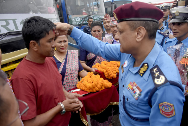 काठमाडौं, १२ असोज । कार्यक्रमका प्रमुख अतिथि थिए नेपाल प्रहरीका महानिरीक्षक सर्वेन्द्र खनाल । सडकमा सक्रियहरुको शुभकामना आदानप्रदानका लागि पुग्दा उनलाई फूलमालाले स्वागत गर्न बसेकाहरु थिए । तर, खनालले सडकमा अहोरात्र खटिने चालक र सहचालकहरुलाई टीका र माला लगाइदिए ।