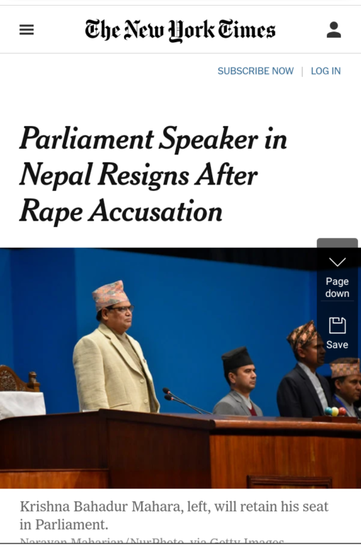 काठमाडौं, १५ असोज । निवर्तमान सभामुख कृष्णबहादुर महरामाथिको बलात्कारको आरोप र राजीनामा प्रकरणबारेको खबर नेपालभित्र मात्र नभई सँसारभर चर्चाको विषय बनेको छ । नेपाली मिडियाले यो विषयलाई प्राथमिकताका साथ प्रकाशन र प्रशारण गरिरहँदा विश्वप्रशिद्ध पत्रिका न्युयोर्क टाइम्सले पनि खबर छापेको छ ।