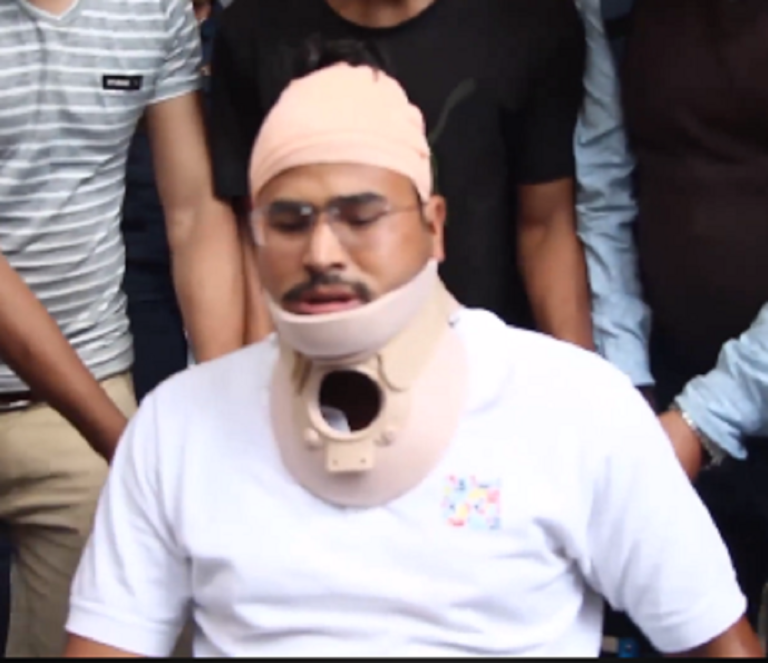 टाउको र खुट्टामा गम्भीर चोट लागेका उनी ह्वीलचियरमा बसेर बोलेका थिए । शाहीको टाउकोमा चोट लागेकाले उपचार सामाग्रीले बेरिएको थियो ।