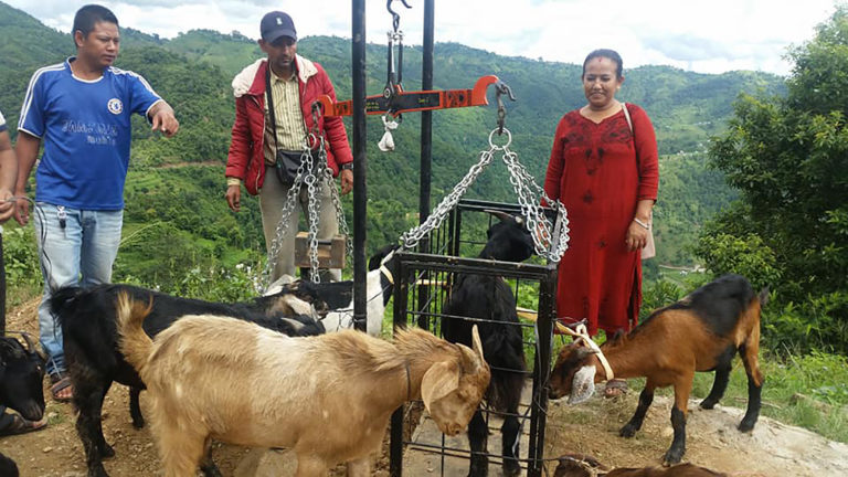 तनहुँको भीमाद नगरपालिका–२ स्थित अरुणोदयमा बिक्रीका लागि खसी जोख्दै । दशैंलाई लक्षित गरी अरुणोदय सामाजिक उद्यमी महिला सहकारी संस्थाले गाउँबाटै खसी बिक्रीको व्यवस्था मिलाएको छ । सहकारीले एकदिनमा रु पाँच लाख बराबरको खसी बिक्री गरेको छ ।