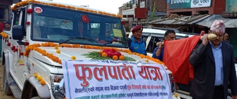 गोरखाबाट ल्याइएको फूलपाती धादिङसम्म गोरखाका पुजारीले, जीवनपुरसम्म धादिङका कुमालले र जीवनपुरबाट काठमाडौँको हनुमानढोकासम्म हनुमानढोकाका पुजारीले फूलपाती लैजाने गरिन्छ । धेरै वर्षपछि फूलपाती भित्र्याएपछि प्रमुख जिल्ला अधिकारी तामाङले शान्तपूर्वक जनतालाई दशैँ मनाउन आग्रह गरे ।रासस