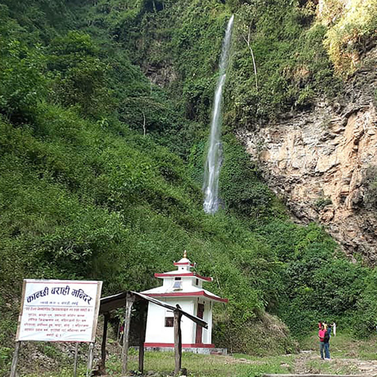 दमौली, २० असोज : तनहुँको म्याग्दे गाउँपालिका–४ मा रहेको कान्छी बाराही मन्दिर र पृष्ठभूमिमा छाङ झर्ना । पछिल्लो समय उक्त ठाउँ आन्तरिक पर्यटकको गन्तव्यस्थलको रुपमा विकास हुँदै गएको छ । तस्वीर : कृष्ण न्यौपाने