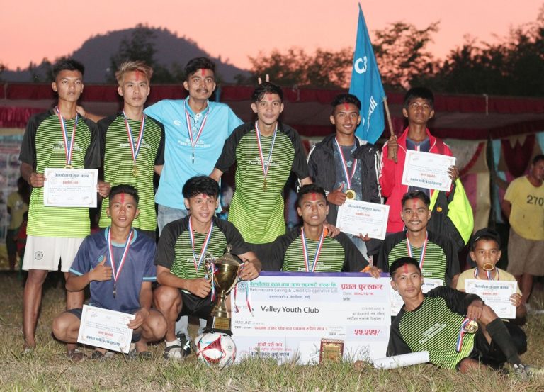 दमौली, २१ असोज : तनहुको शुक्लागण्डकी नगरपालिका–५ स्थित बेलचौतारा युवा क्लवले बडा दशैंको अवसरमा आयोजना गरेको दशैं कपको उपाधि विजेता भ्याली युवा क्लवका खेलाडी । आयोजक बेलचौतारा युवा क्लवलाई ३–० गोल अन्तरले पराजित गर्दै भ्यालीले नगद रु ५५ हजार पाँच सय ५५ प्राप्त गरेको छ । तस्वीर : कृष्ण न्यौपाने, दमौली