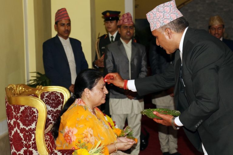 काठमाडौँ, २१ असोज : राष्ट्रपति विद्यादेवी भण्डारी विजया दशमीका दिन मंगलबार राष्ट्रपति कार्यालयमा आफन्तबाट टीका ग्रहण गर्दै । तस्वीर : रत्न श्रेष्ठ ।