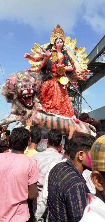 इनरुवा, २२ असोज : सुनसरीको कोशी गाउपालिका– ६ मा रहेको दुर्गा मन्दिरमा निर्माण गरिएको माटाको कलात्मक दुर्गा भगवतीको मूर्ति कोशी व्यारेजमा बुधबार सोलाउने (भसाउने) तयारी गर्दै स्थानीयवासी । तस्विर अजितकुमार झा