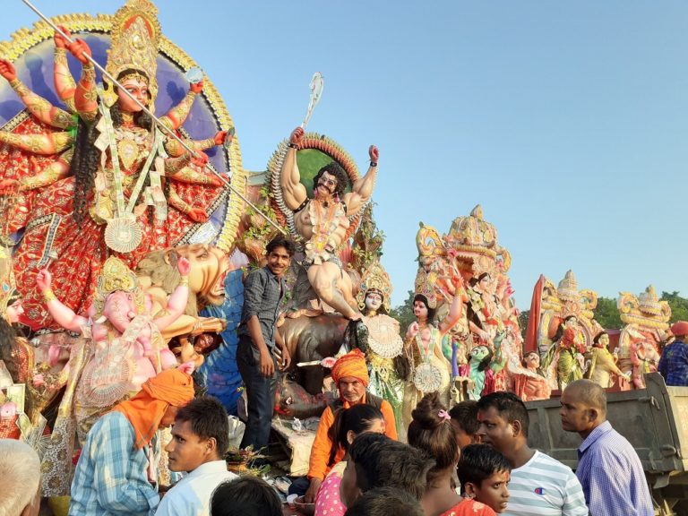 परासी, २३ असोज : बडादशैँको नवरात्रभर पुजाअर्चनाका लागि विभिन्न स्थानमा बनाईएका दुर्गाभवानीका मूर्तिहरु बुधबार पश्चिम नवलपरासीको परासीमा प्रदर्शनी गरिदैँ । उक्त मूर्तिहरु आज त्रिवेणीधाममा सेलाईदैँछ । तस्वीर : मोहन पौडेल
