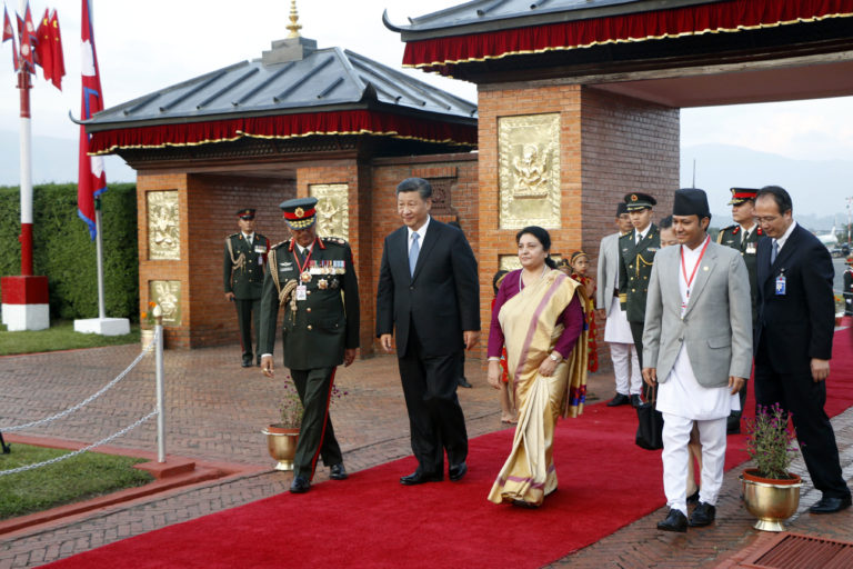 दुईदिने राजकीय भ्रमणमा शनिबार नेपाल आउनुभएका जनवादी गणतन्त्र चीनका राष्ट्रपति सी चिनफिङलाई त्रिभुवन अन्तरराष्ट्रिय विमानस्थलमा स्वागत गर्नुहुँदै राष्ट्रपति विद्यादेवी भण्डारी । तस्बिर :नवीन पौडेल