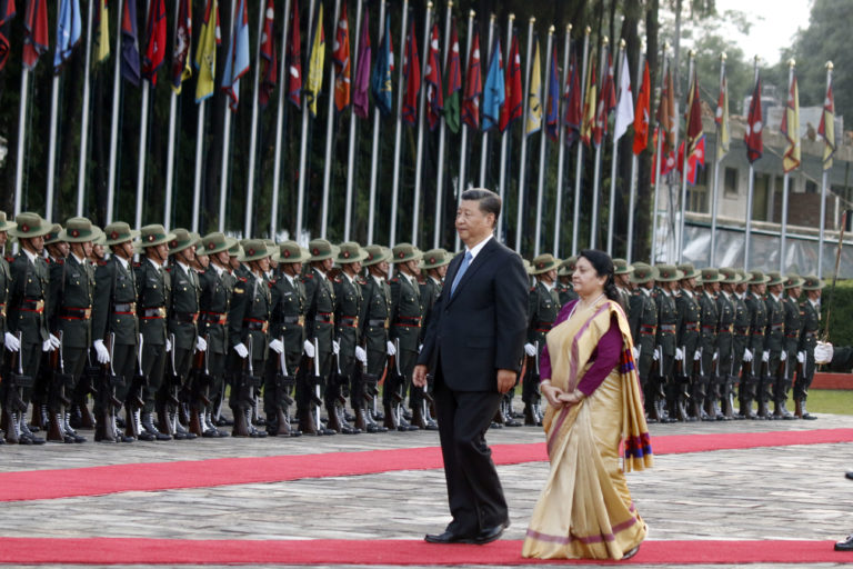 दुईदिने राजकीय भ्रमणमा शनिबार नेपाल आएका मित्रराष्ट्र चीनका राष्ट्रपति सी चिनफिङ त्रिभुवन अन्तरराष्ट्रिय विमानस्थलमा नेपाली सेनाको सम्मान गारत निरीक्षण गर्दै । तस्बिर : नवीन पौडेल