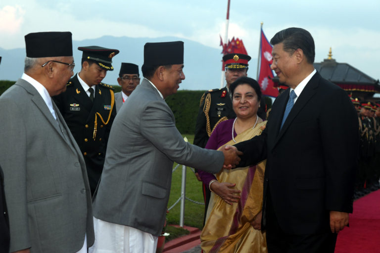 चीनका राष्ट्रपति सी चिनफिङको शनिबार त्रिभुवन अन्तरराष्ट्रिय विमानस्थलमा स्वागत गर्दै उपराष्ट्रपति नन्दबहादुर पुन । तस्वीर :’नवीन पौडेल