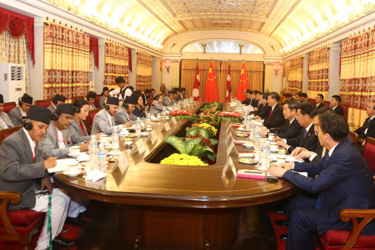 चीनका राष्ट्रपति सी चिनफिङ र राष्ट्रपति विद्यादेवी भण्डारी शनिबार साँझ शीतल निवासमा द्विपक्षीय वार्तामा सरिक हुदै ।