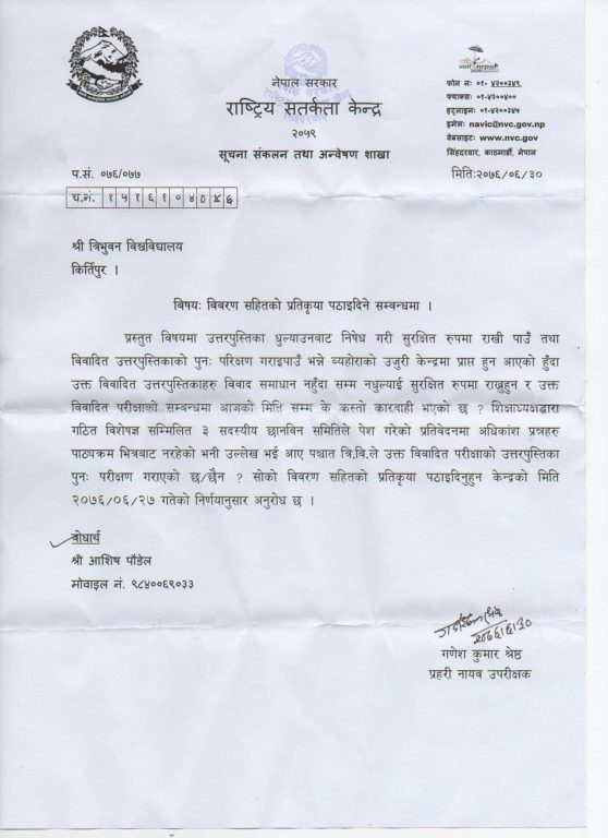 उत्तरपुस्तिका विवाद समाधान नभउको भन्दै नधुल्याई सुरक्षित रुपमा राख्न र त्यसउपर कारबाही भए नभएकोबारे जानकारी समेत मागेको छ । विवादित परीक्षाको उत्तरपुस्तिका पुनः परीक्षण गराएको छ छैन सोको विवरण समेत मागेपछि समस्या गहिरिएको छ ।