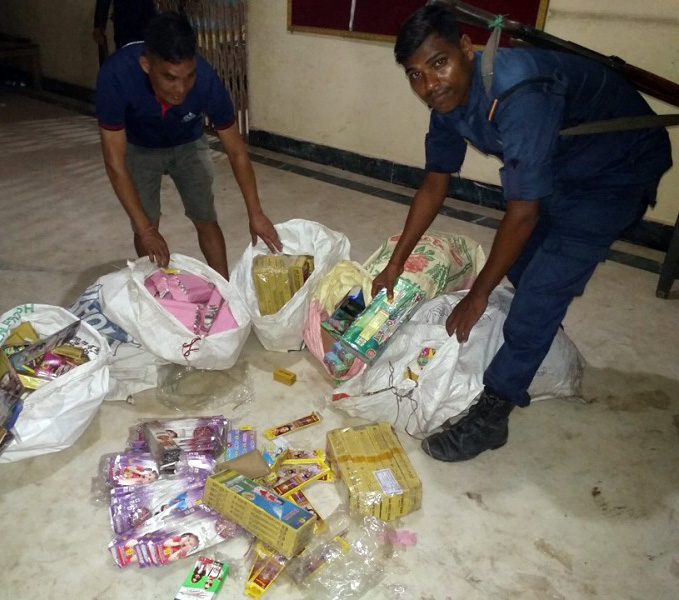 जिल्ला प्रहरी कार्यालय सप्तरीबाट खटिएको प्रहरीको टोलीले सप्तरीको राजविराज नगरपालिका–४ स्थित नेताचोकबाट बरामद गरिएको पटाका देखाउँदै । तस्वीर : अरुणकुमार यादव