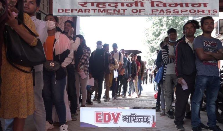 नेपालमा गतिलो रोजगारी पाइन्थ्यो भने को जान्थ्यो विदेश । न भनेजस्तो काम न कामअनुसारको पारिश्रमिक । त्यसैले लाखौँ युवाहरु विदेश पलायन भइहरका छन् । अमेरिकाले यसै वर्षदेखि इडीभीको लागि पासपोर्ट नम्बर अनिवाय रुपमा चाहिने भएको कारण राहदानी विभागमा अहिले युवायुवतीहरु पासपोर्टका लागि लाई बस्नकोे भीड अत्याधीक रुपमा रहेको छ ।