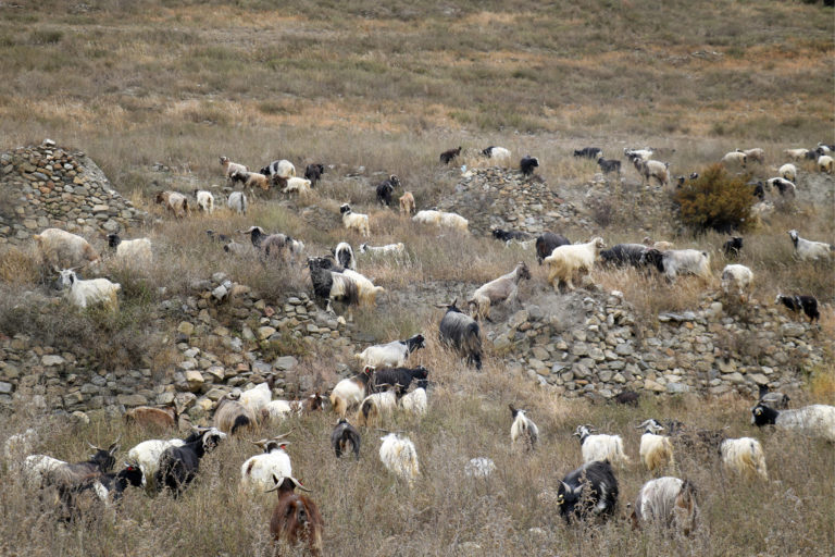 मनाङ जिल्लाको माथिल्लो गाउँ ङिस्याङ गाउँ पालिका भ्राकामा चराइ राखिएको भेडा, च्याङ्ग्राको बथान । तस्वीर :रत्न श्रेष्ठ