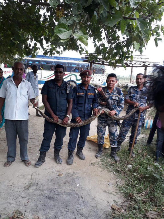 सप्तरीको तिलाठी गाउँपालिका १ स्थित खाँडोमा शनिबार अन्दाजी ७ फिट लामो अजिङ्गर फेला परेको छ । करिब १२ केजी वजन भएको उक्त अजिङ्गरलाई नेपाल प्रहरी र शसस्त्र प्रहरीबलको टोलीले नियन्त्रणमा लिई जिल्ला डिभिजन वन कार्यालयको सकुशल जिम्मा लगाइएको छ । तस्बीर : अरुण कुमार यादव