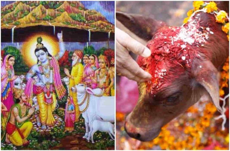 कृष्णले एकदिन गोकुलवासीहरूलाई केही नदिने इन्द्रको पूजा गर्नुभन्दा खनिज, घाँस, पानी, दाउरा इत्यादि दिने गोवर्धन पर्वतको पूजा गर्दा राम्रो हुन्छ । त्यसैले सवै गोकुलवासीले गोवर्धन पर्वतको पूजा गर्न थाल भने । आफ्नो ठाउँमा गोवर्धन पर्वतलाई पूजा गरेको देखेर इन्द्रले रिसको झोकमा गोकुलमा असिना र पानी वर्षाइदिए । त्यसबाट बचाउन कृष्ण भगवानले गोवर्धन पर्वतलाई हातले उचालेर सबै गोकुलवासीहरूलाई आश्रय दिए । अन्त्यमा इन्द्रले आफ्नो हार मानि गल्तिको लागि कृष्ण समक्ष माफी मागे । त्यसै समयदेखि गोवर्धन पूजाको आरम्भ भएको पौराणिक मान्यता रहिआएको छ ।