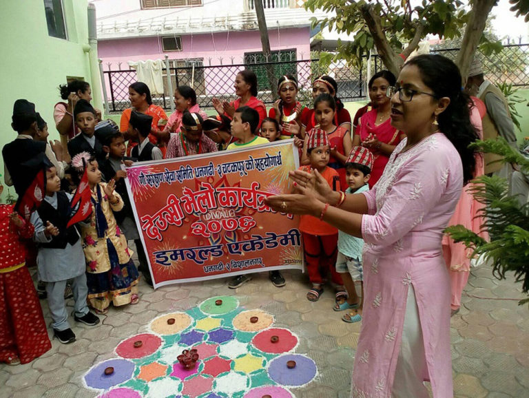 तिहारका अवसरमा धनगढी– ३ चटकपुरमा निर्माणगर्न लागिएको आधुनिक गौशालाको सहयोगार्थ देउसी भैलो खेलेर आर्थिक रकम संकलन गर्दै इमरल्ड एकेडेमीका शिक्षिका तथा छात्रछात्रा । तस्वीरः तिलकराज ओझा