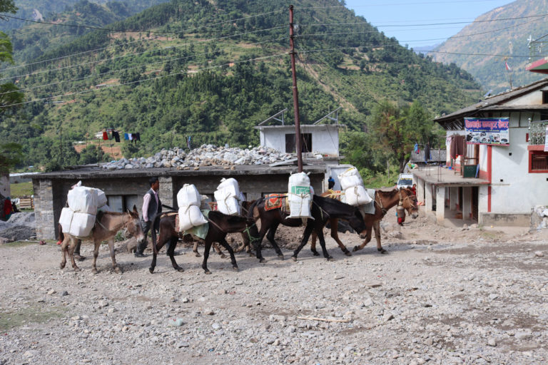 सडक पहुँच नभएको डोल्पाको मुड्केचुला गाउँपालिकाका स्थानीय नलगाड नगरपालिकास्थित बजारबाट सामग्री खच्चडमा लिएर जाँदै । तस्वीर : हेमन्त केसी